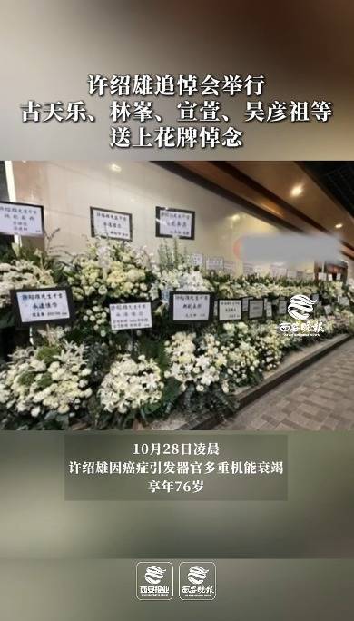 据澎湃新闻消息,11月17日,许绍雄追悼会现场,佘诗曼、黄子华、黄宗泽、关礼杰、张家辉、苗侨伟、李国麟等到场悼念,成龙、吴彦祖、古天乐、宣萱、胡杏儿、林峯等众星送上了悼念花牌。家属表示丧事从简,按遗愿将帛金全数捐给儿童癌病基金。